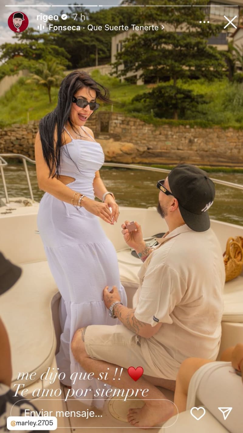 A través de redes sociales, el cantante compartió algunas postales del emotivo momento. Tal como se puede ver, Rigeo le pidió matrimonio a su novia mientras estaban de paseo en un yate.