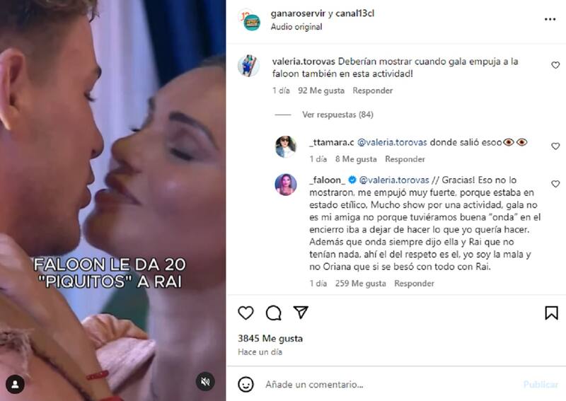 Esta escena fue compartida a través de las redes sociales del reality, donde desató una ola de comentarios. Pero uno de ellos apuntaba a una escena que no había sido mostrada en el capítulo. “Deberían mostrar cuando Gala empuja a la Faloon también en esta actividad”, escribió una usuaria.