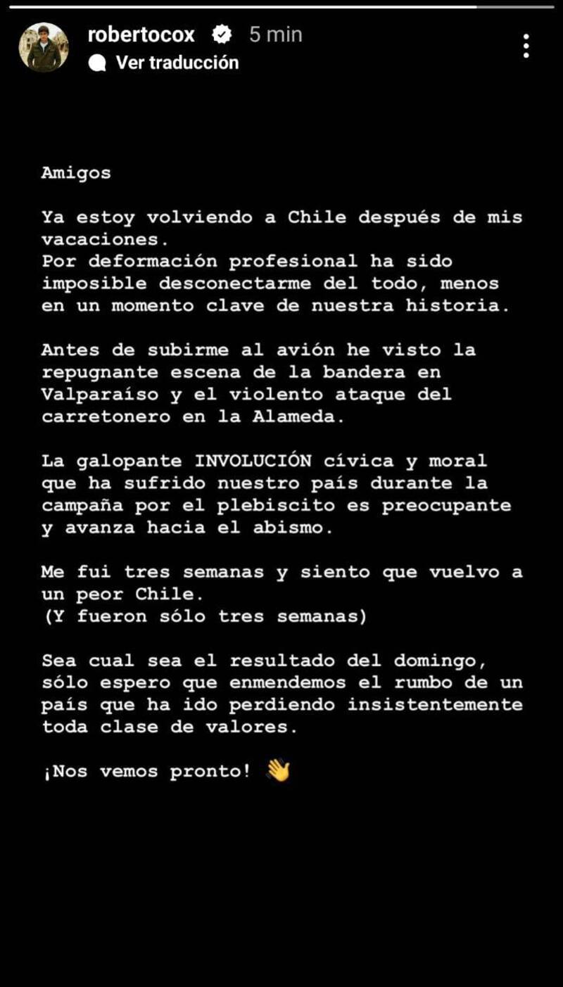 Roberto Cox se encuentra finalizando sus vacaciones en el extranjero. A pesar de estar lejos de Chile, el comunicador ha estado atento a los últimos hechos que han acontecido.
