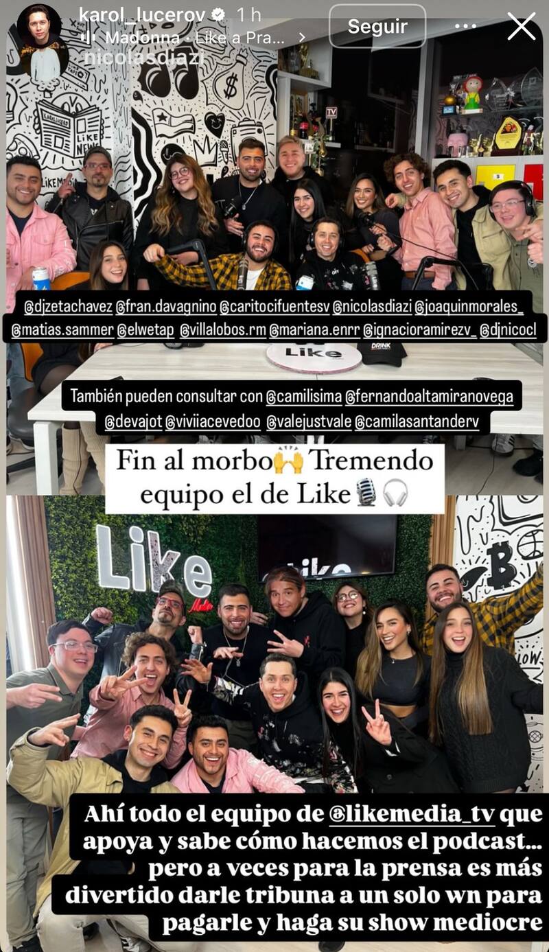 “Fin del morbo, tremendo equipo el de Like. Ahí todo el equipo de Like Media que apoya y sabe cómo hacemos el podcast… pero a veces para la prensa es más divertido darle tribuna a un solo hueón para pagarle y haga su show mediocre”, lanzó sin pelos en la lengua.