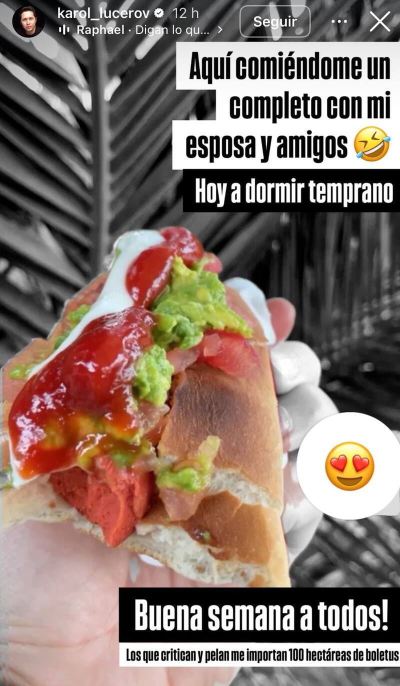 “Aquí comiéndome un completo con mi esposa y amigos. Hoy a dormir temprano. Buena semana a todos”, ironizó el ex conductor de Yingo a través de sus historias de Instagram.