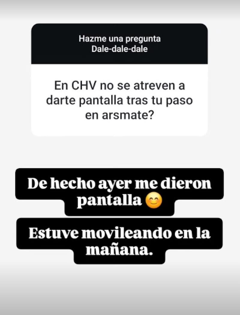 “¿En CHV no se atreven a darte pantalla tras tu paso en Arsmate?”, le consultaron en Instagram. “De hecho, ayer me dieron pantalla. Estuve movileando en la mañana”, aclaró la periodista.
