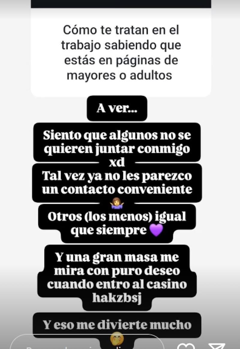 “¿Cómo te tratan en el trabajo sabiendo que estás en páginas de mayores o adultos?”, le preguntó otro usuario. “A ver... siento que algunos no se quieren juntar conmigo. Tal vez no les parezco un contacto conveniente. Otros (los menos) igual que siempre, y una gran masa me mira con puro deseo cuando entro al casino. Y eso me divierte mucho”, respondió María Paz.