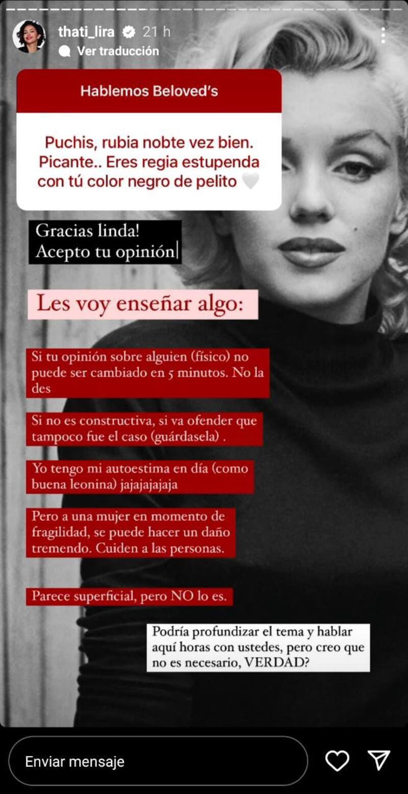 Respecto a su cambio de look, usuarias aplaudieron su nuevo cabello pero otras también la criticaron duramente. “Puchis, rubia no te vez bien. Picante… eres regia estupenda con tu color negro de pelito”, le escribió una seguidora, mientras que la influencer reaccionó con un potente mensaje.