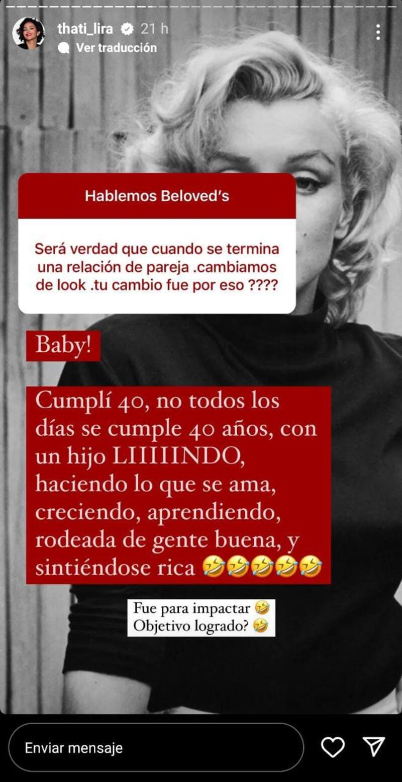 “Baby, cumplí 40, no todos los días se cumple 40 años, con un hijo LIIIIINDo, haciendo lo que se ama, creciendo, aprendiendo, rodeada de gente buena, y sintiéndose rica. Fue para impactar. Objetivo logrado?”, señaló Thati Lira sorprendiendo con su respuesta.
