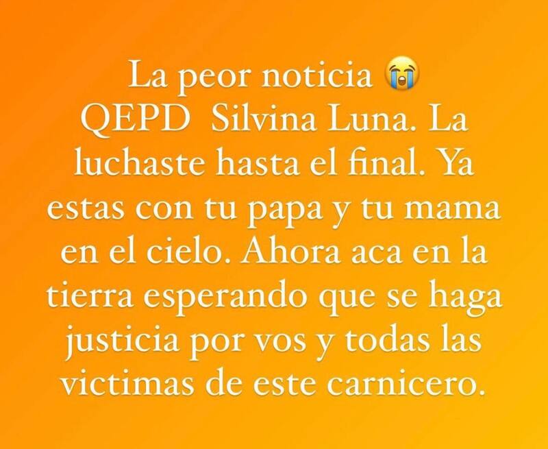 “La peor noticia. La luchaste hasta el final. Ya estás con tu papá y tu mamá en el cielo. Ahora acá en la Tierra esperando que se haga justicia por vos y todas las víctimas de este carnicero”, escribió en su cuenta de Instagram, donde también subió una foto de los primeros años que trabajando juntas en el modelaje.