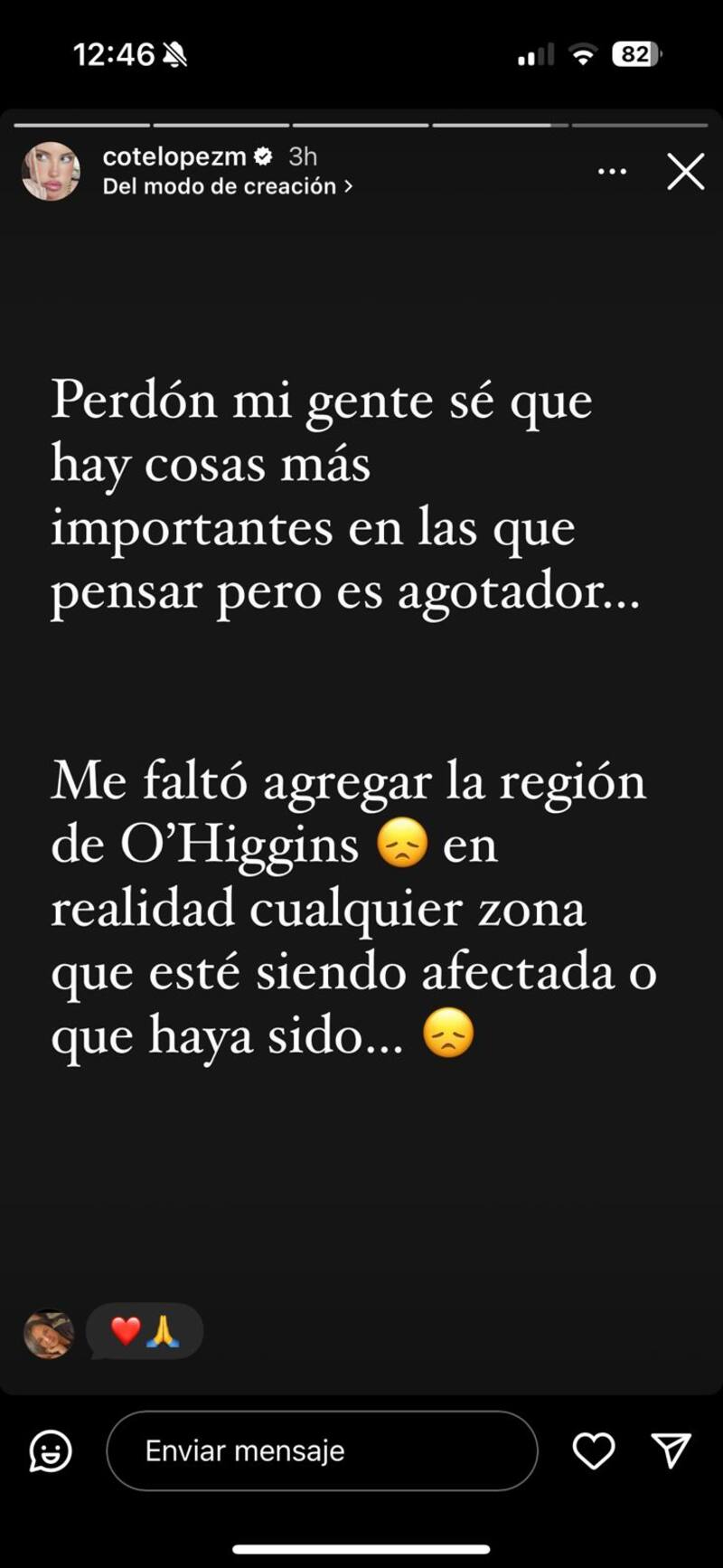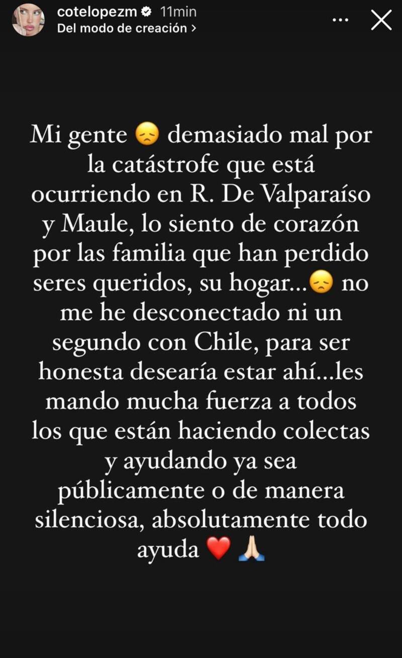 “Mi gente: estoy demasiado mal por la catástrofe que está ocurriendo en la región de Valparaíso y Maule. Lo siento de corazón por las familias que han perdido a sus seres queridos, su hogar. No me he desconectado ni un segundo con Chile. Para ser honesta, desearía estar ahí”, relató de entrada.