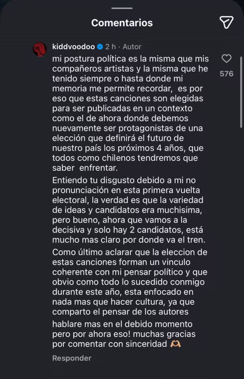 Durante la primera vuelta, Kidd Voodoo dejó en reserva su predilección, lo que llevó a que recibiera una ola de comentarios pidiéndole que se la jugara con una opción: Jeannette Jara o José Antonio Kast.