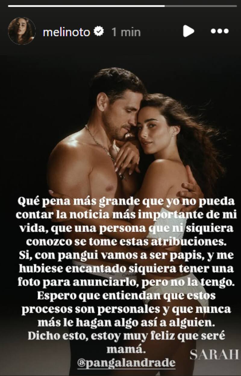 “Qué pena más grande que yo no pueda contar la noticia más importante de mi vida, que una persona que ni siquiera conozco se tome estas atribuciones. Sí, con Pangui vamos a ser papis, y me hubiese encantado siquiera tener una foto para anunciarlo, pero no la tengo”, publicó.