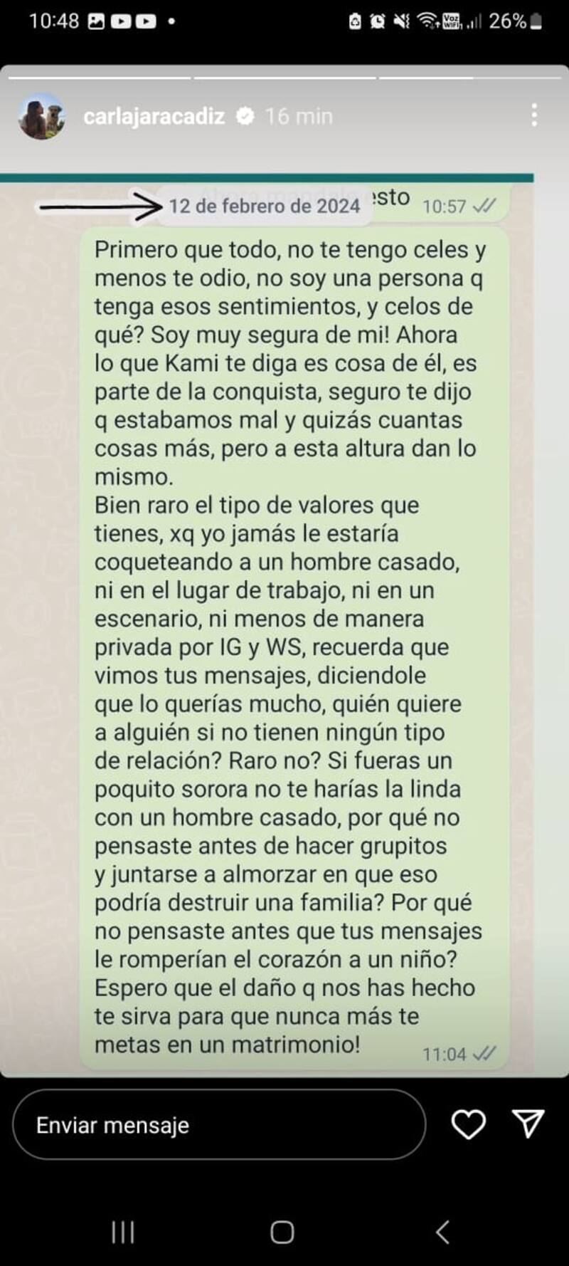 “Cansada de mentiras” y en respuesta a desmentidos, Carla Jara arremetió con todo y mostró sus pruebas sobre la supuesta infidelidad que hizo caer su matrimonio con Francisco Kaminski. Apuntó directamente a Camila Andrade.