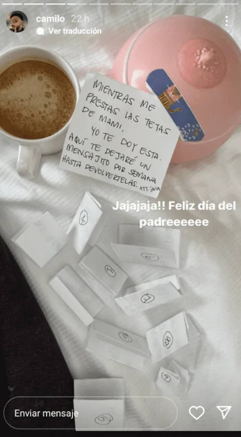Sin embargo, lo que más llamó la atención fue lo que compartió Camilo en sus historias. Con un mensaje, escrito como si viniera de Índigo, el cantante mostró la “teta” que regalaron.