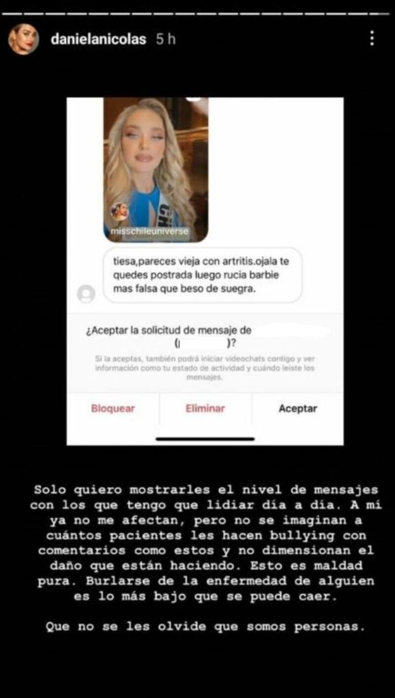 La modelo y actriz Daniela Nicolás, que en las últimas semanas nos representó en el certamen Miss Universo en su versión 2021, compartió un mensaje desubicado, por decir lo menos, que le llegó a su cuenta de Instagram.