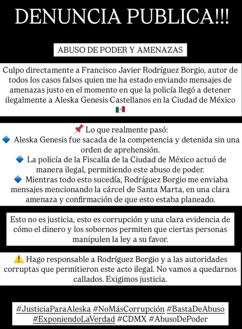 “Culpo directamente a Francisco Javier Rodríguez Borgio, autor de todos los casos falsos quien me ha estado enviando mensajes de amenazas justo en el momento en que la policía llegó a detener ilegalmente a Aleska Genesis Castellanos en la Ciudad de México”, escribió Castellanos.