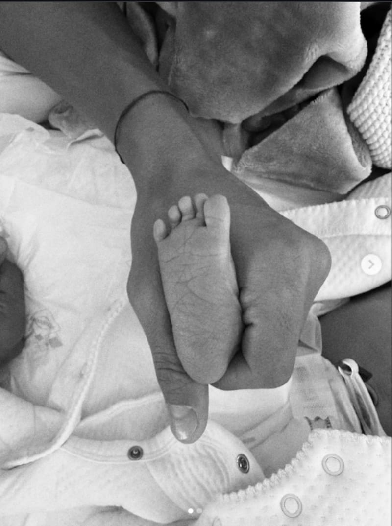 En una de las postales, se muestra el pie de la recién nacida, mientras que en la otra se ve a Sánchez besando a Litvinova, quien tiene a su hija en su pecho.