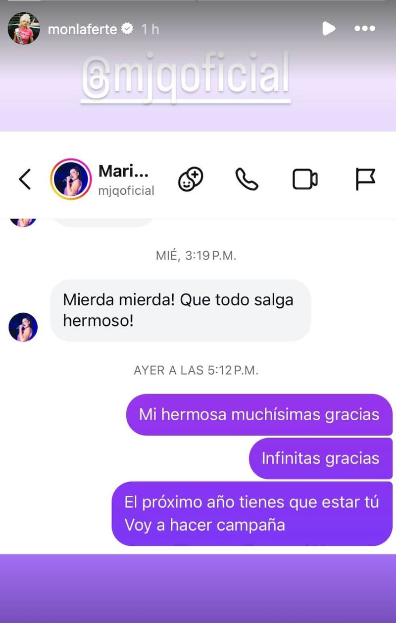 La intérprete de Tu falta de querer compartió en Instagram un comentario de su colega, donde le enviaba la mejor de las vibras de cara a su espectáculo en el certamen viñamarino.