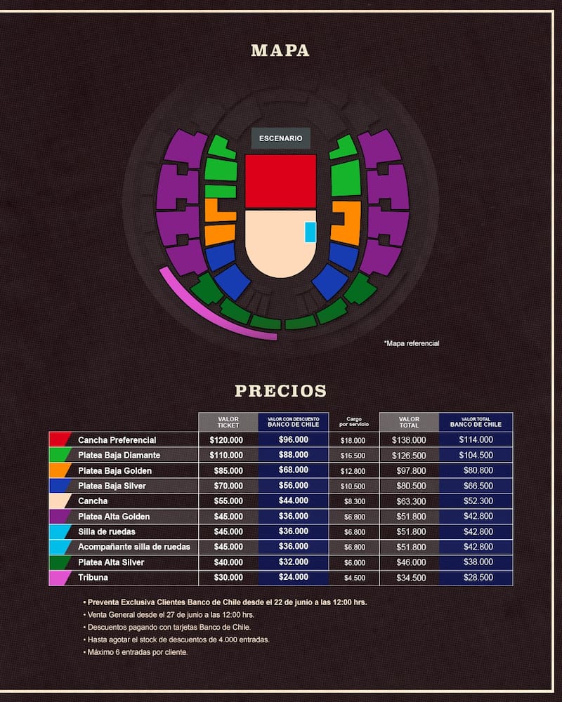 Las entradas estarán disponible en www.puntoticket.com Habrá una preventa exclusiva Banco de Chile, 22 de junio, 12:00 pm al 24 de junio, 11:59 am. Mientras que la venta general, se realizará el día 27 de junio, 12:00 pm.