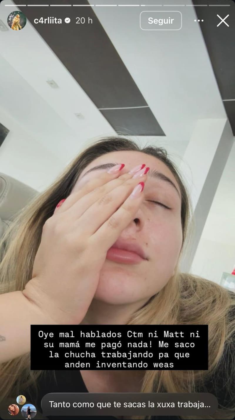 “Oye, mal hablados ctm, ni Matt (Hunter) ni su mamá me pagó nada. Me saco la chucha trabajando pa’ que anden inventando weas”, disparó la joven.