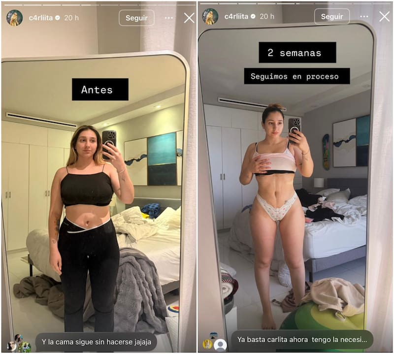 En sus historias de Instagram, la influencer compartió dos postales resaltando su antes y después tras el procedimiento. “2 semanas, seguimos en proceso”, escribió Carlita junto a los registros.