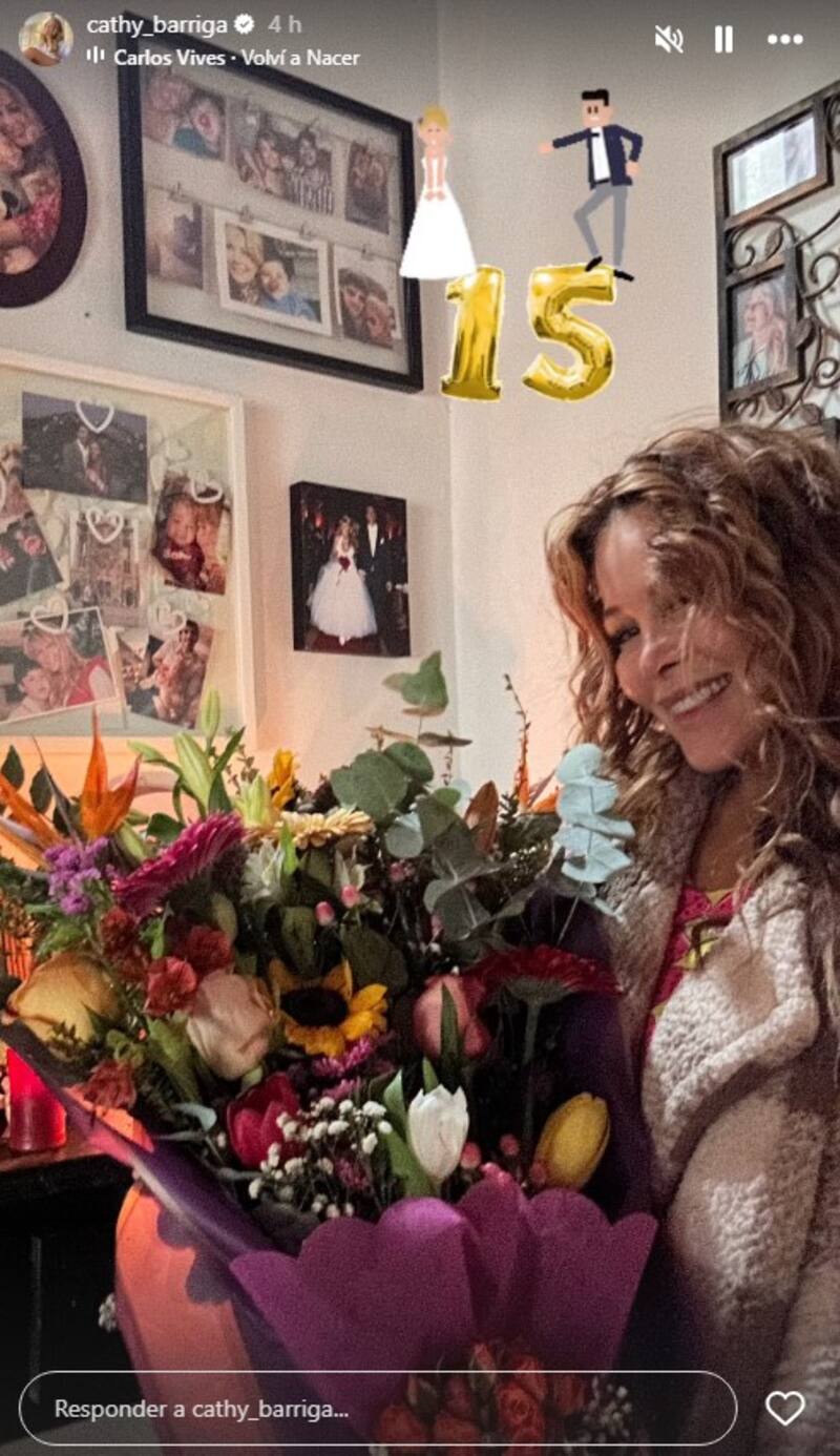 Fue así como compartió en sus historias de Instagram una foto donde se le ve contenta y con tremendo ramo de flores que seguramente le obsequió su galán, por motivo de su aniversario de matrimonio. De fondo, un set de fotografías en la pared que dan testimonio de esta década y media de romance.