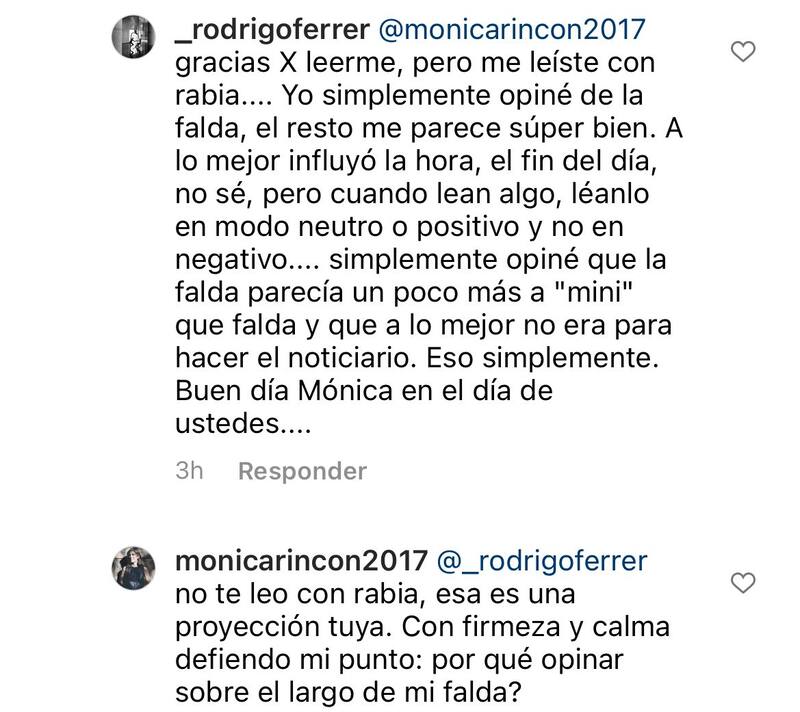 Eso sí, Rincón no quedó conforme y lo volvió a repasar. “No te leo con rabia, esa es una proyección tuya. Con firmeza y calma defiendo mi punto: ¿por qué opinar sobre el largo de mi falda?”,cerró.