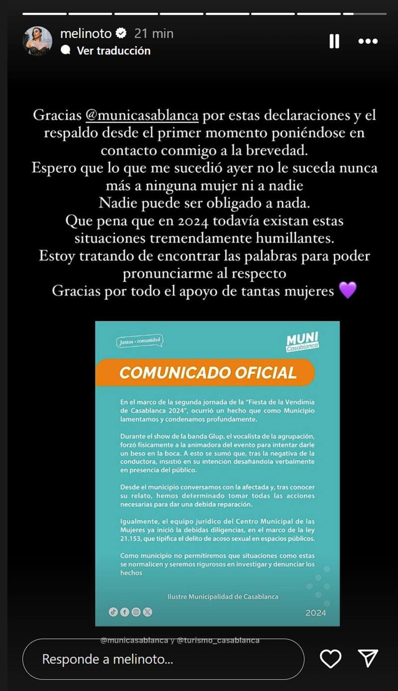 Por su parte, Melina también se refirió a este incidente, y agradeció el apoyo de la municipalidad. “Espero que lo que me sucedió ayer no le suceda nunca más a ninguna mujer ni a nadie. Nadie puede ser obligado a nada. Qué pena que en 2024 todavía existan esas situaciones tremendamente humillantes”