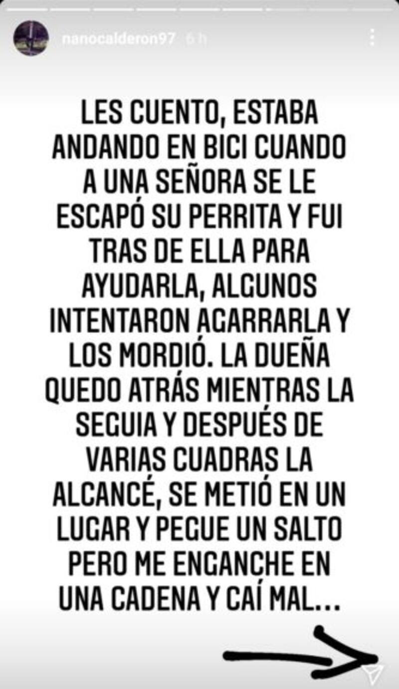 A través de sus historias de Instagram, Hernán Calderón Jr aseguró que quiso realizar una buena acción, pero terminó sufriendo un accidente. "Estaba andando en bici cuando a una señora se le escapó su perrita y fui tras de ella para ayudarla. Algunos intentaron agarrarla y los mordió", señaló.