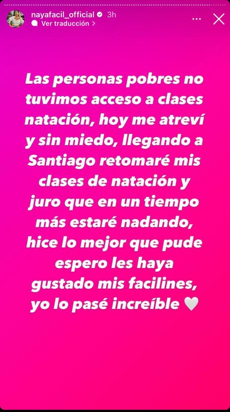 “Las personas pobres no tuvimos acceso a clases de natación, hoy me atreví y sin miedo, llegando a Santiago retomaré mis clases de natación y juro que en un tiempo más estaré nadando”, comenzó diciendo.