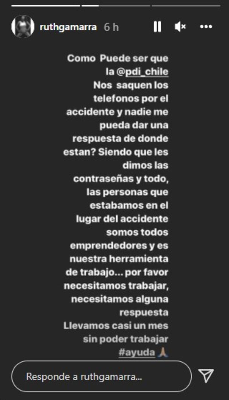 “¿Cómo puede ser que la PDI nos saquen los teléfonos por el accidente y nadie me pueda dar una respuesta de dónde están? Siendo que les dimos las contraseñas y todo, las personas que estábamos en el lugar del accidente”, detalló Gamarra en la red social.