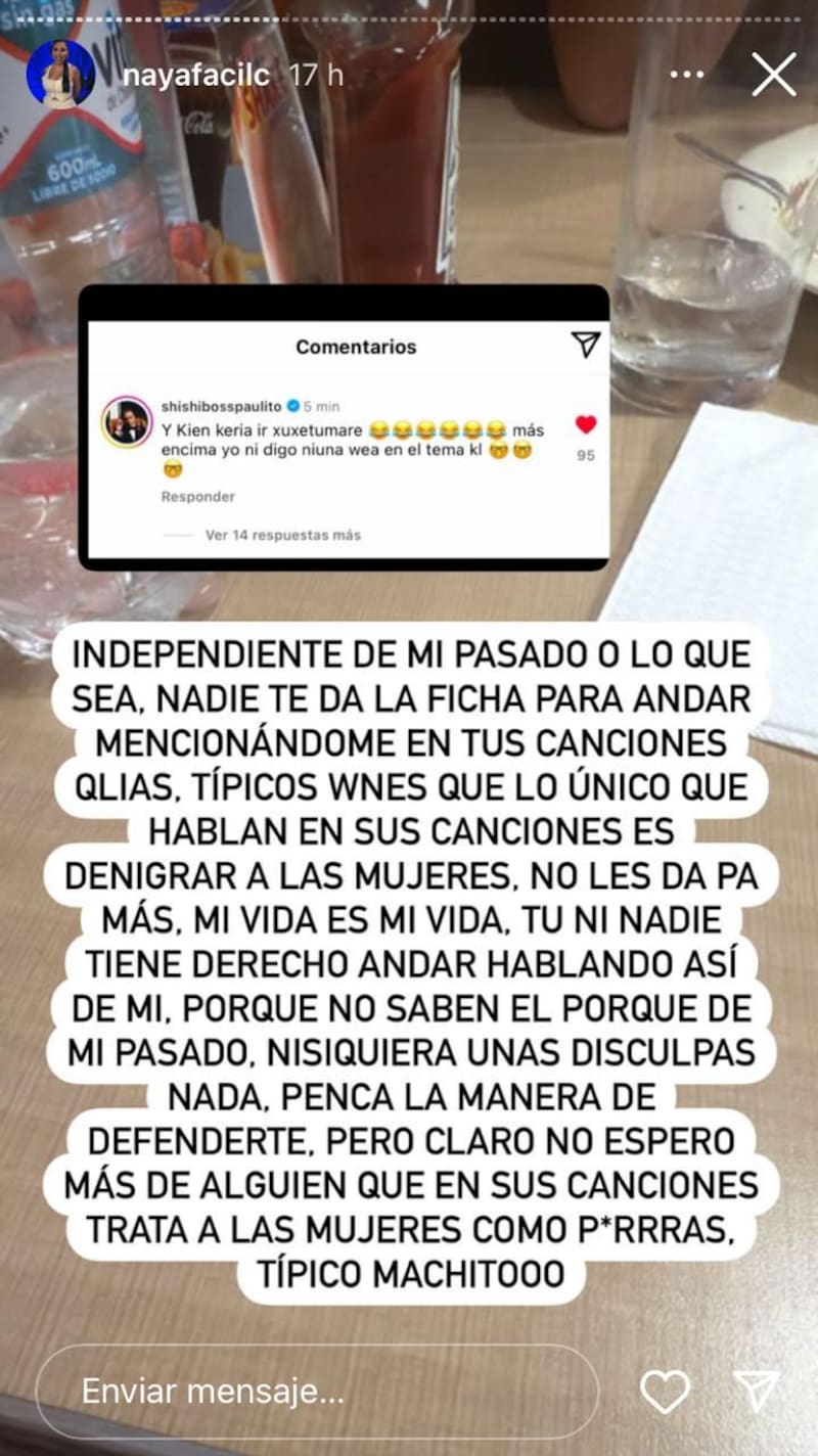 Naya no se quedó callada, en sus historias compartió el comentario del artista y se lanzó con todo contra el cantante por su canción.