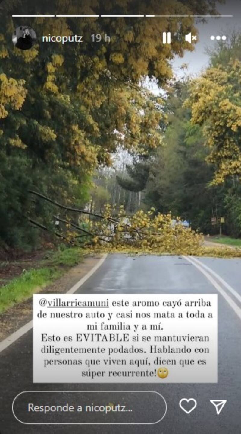 “@Villaricamuni este aromo cayó arriba de nuestro auto y casi nos mata a toda mi familia y a mí. Esto es EVITABLE si se mantuvieran diligentemente podados. Hablando con personas que viven aquí, dicen que es super recurrente!”, arremetió intentando evitar nuevos accidentes.