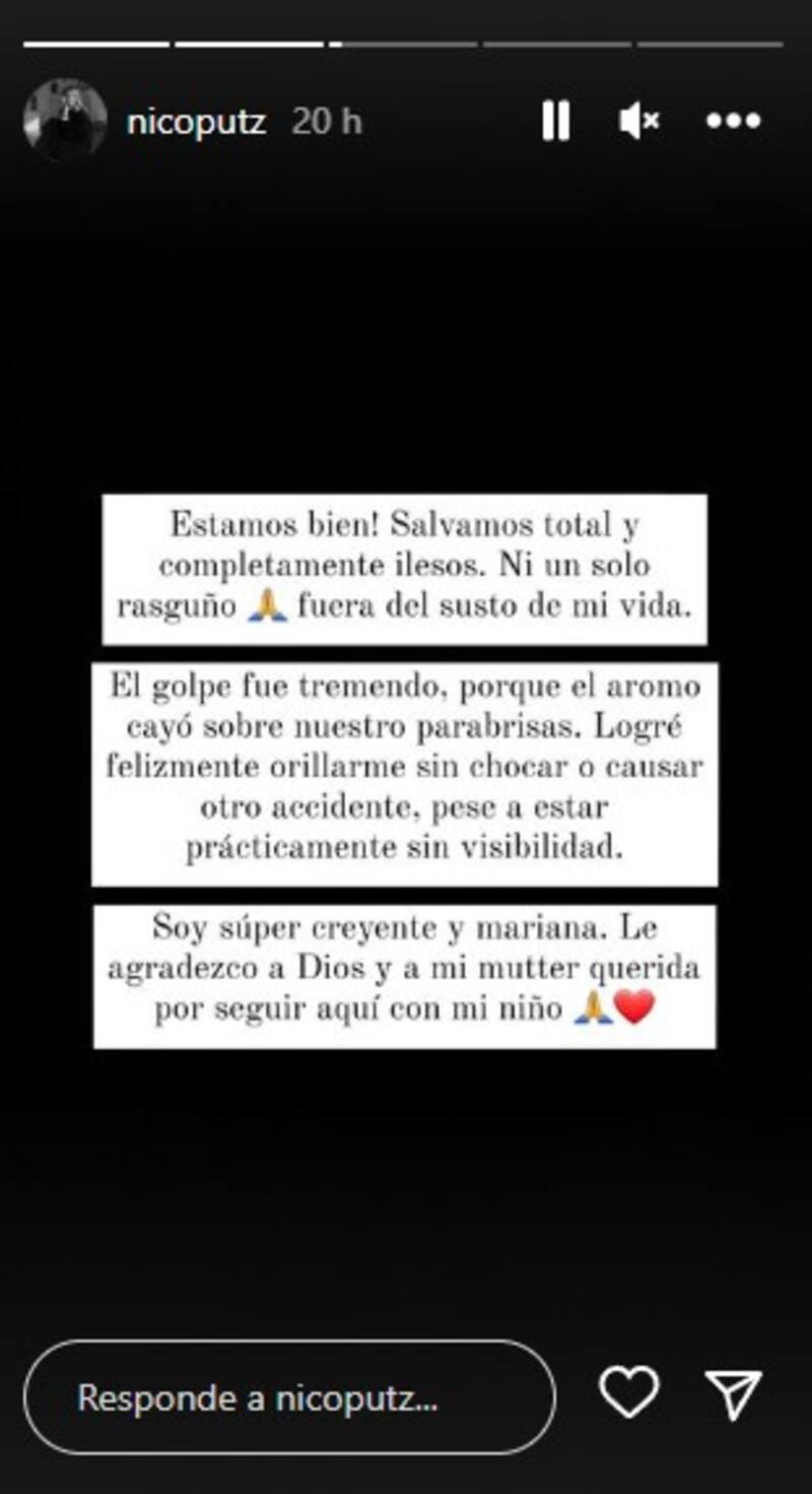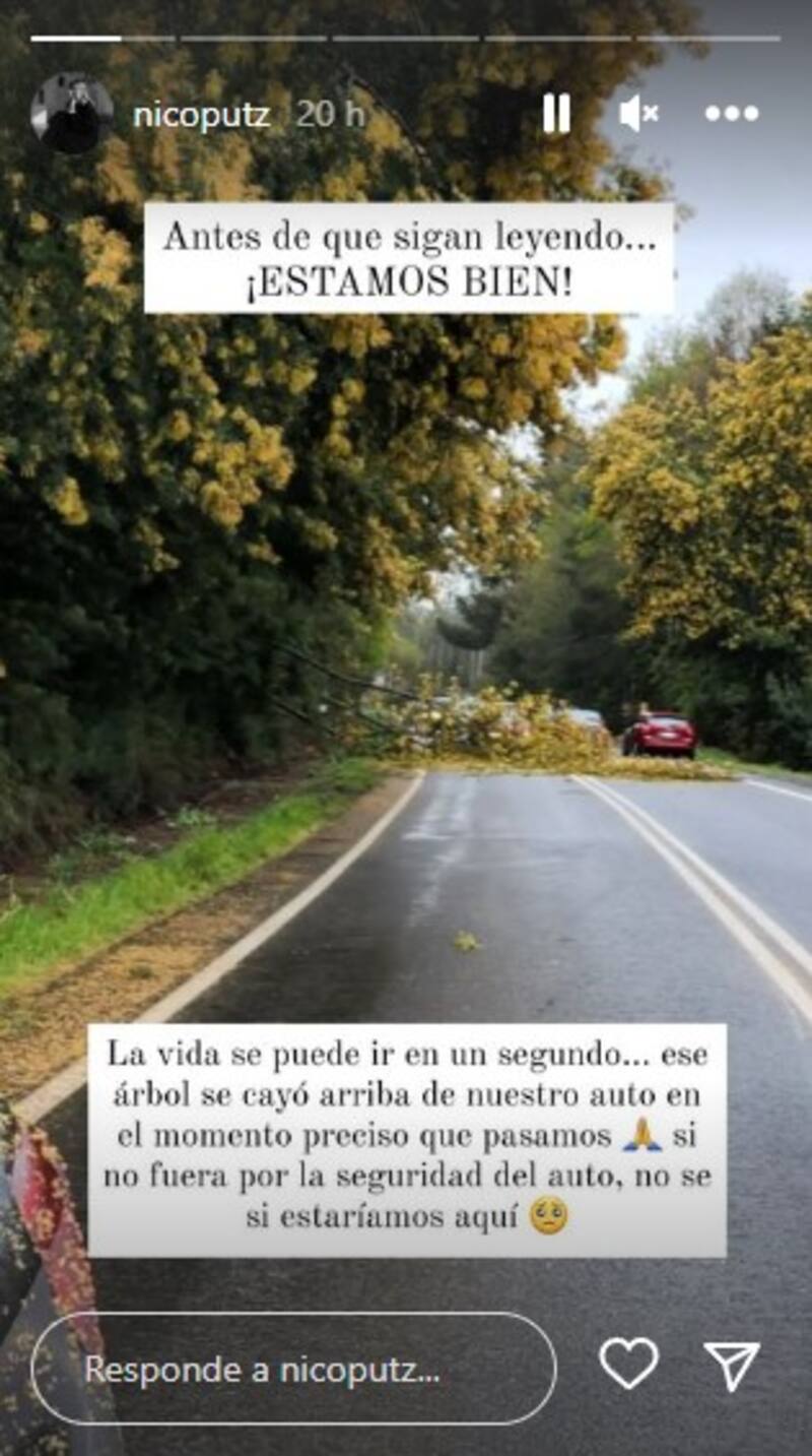 “Antes de que sigan leyendo… ¡ESTAMOS BIEN! La vida se puede ir en un segundo… ese árbol se cayó arriba de nuestro auto en el momento preciso que pasamos. Si no fuera por la seguridad del auto, no sé si estaríamos aquí”, expresó.