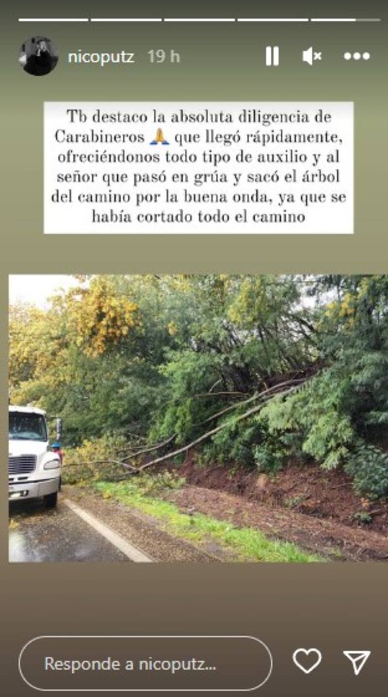 “También destaco la absoluta diligencia de Carabineros que llegó rápidamente, ofreciéndonos todo tipo de auxilio y al señor que pasó en grúa y sacó el árbol del camino por la buena onda, ya que se había cortado todo el camino”, agregó sorprendiendo con sus dichos.