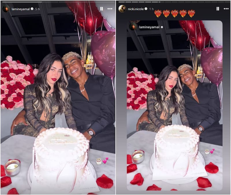 Sucede que fue el propio Yamal el que compartió una postal, de ambos frente a una torta blanca y rodeados de pétalos rojos y rosados, al parecer en una fiesta de celebración durante la noche del 24 de agosto.