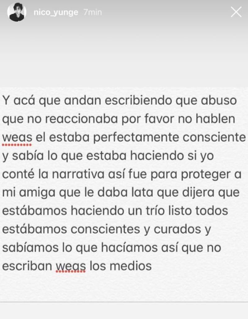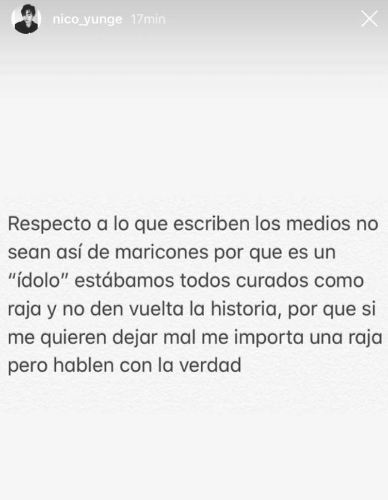 Ante el revuelo de sus declaraciones, Nico Yunge publicó dos historias de Instagram para aclarar lo sucedido.