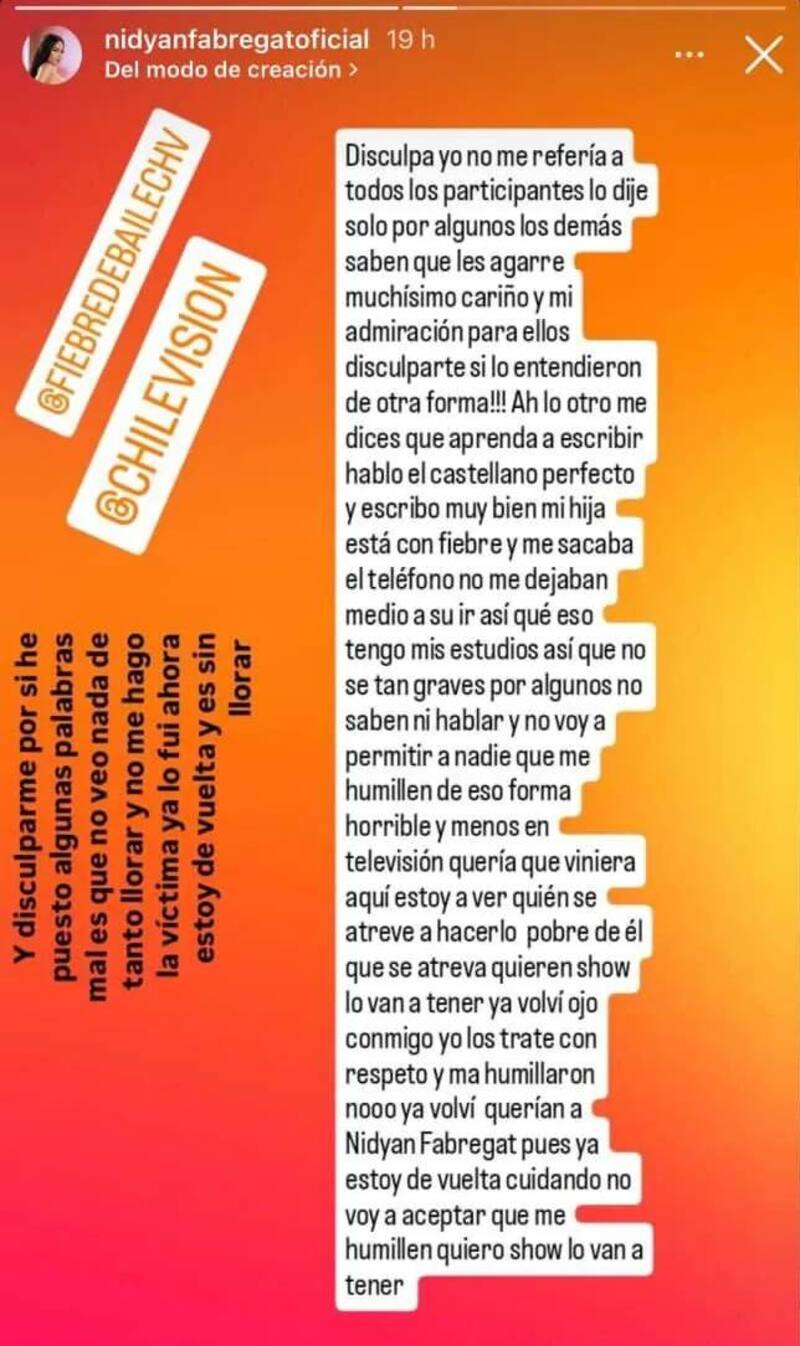 “No voy a permitir a nadie que me humillen de esa forma horrible y menos en televisión. Querían que viniera, aquí estoy, a ver quién se atreve a hacerlo. Pobre del que se atreva. ¿Quieren show? Lo van a tener, ya volví, ojo conmigo, yo los traté con respeto y me humillaron. Querían a Nidyan Fabregat, pues ya estoy de vuelta. Cuidado, no voy a aceptar que me humillen. ¿Quieren show? Lo van a tener”, remató.