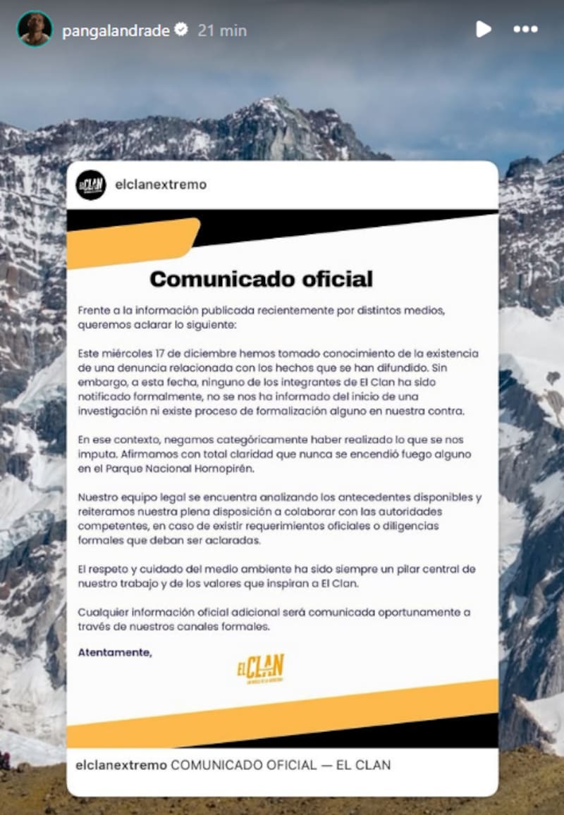 El equipo de “El Clan”, programa que protagonizan Pangal Andrade, su hermano y sus primos, respondió al anuncio de formalización en su contra, acusados de encender fuego en un parque nacional.