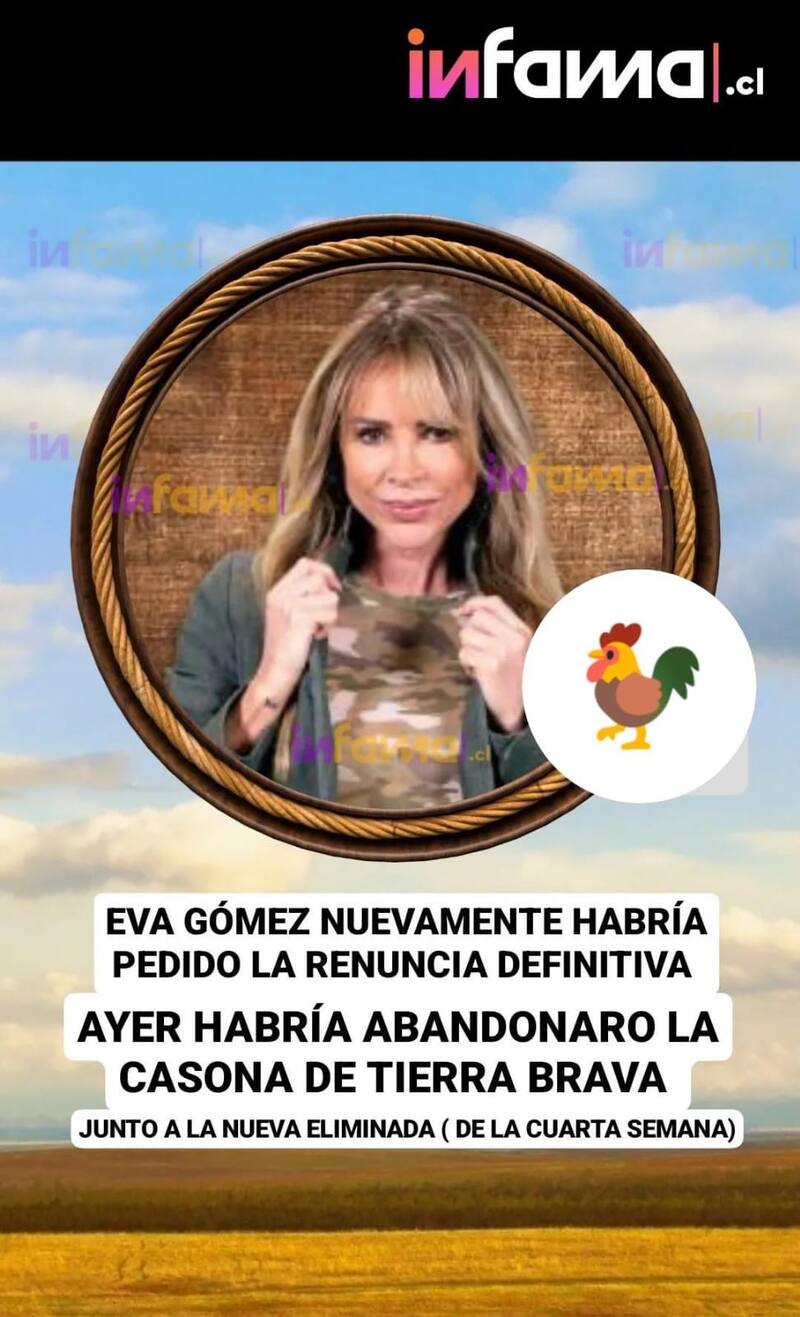 Recientemente el sitio Infama reveló que el reality perdió a un gran rostro, ya que Eva Gómez solicitó la renuncia. No sería la primera vez que la ex animadora del Festival de Viña piensa en declinar, ya que durante las primeras semanas, el mismo portal filtró que “pidió la renuncia y se fue, pero luego de hablar casi dos horas con la producción, desestimó su renuncia y siguió en competencia”.