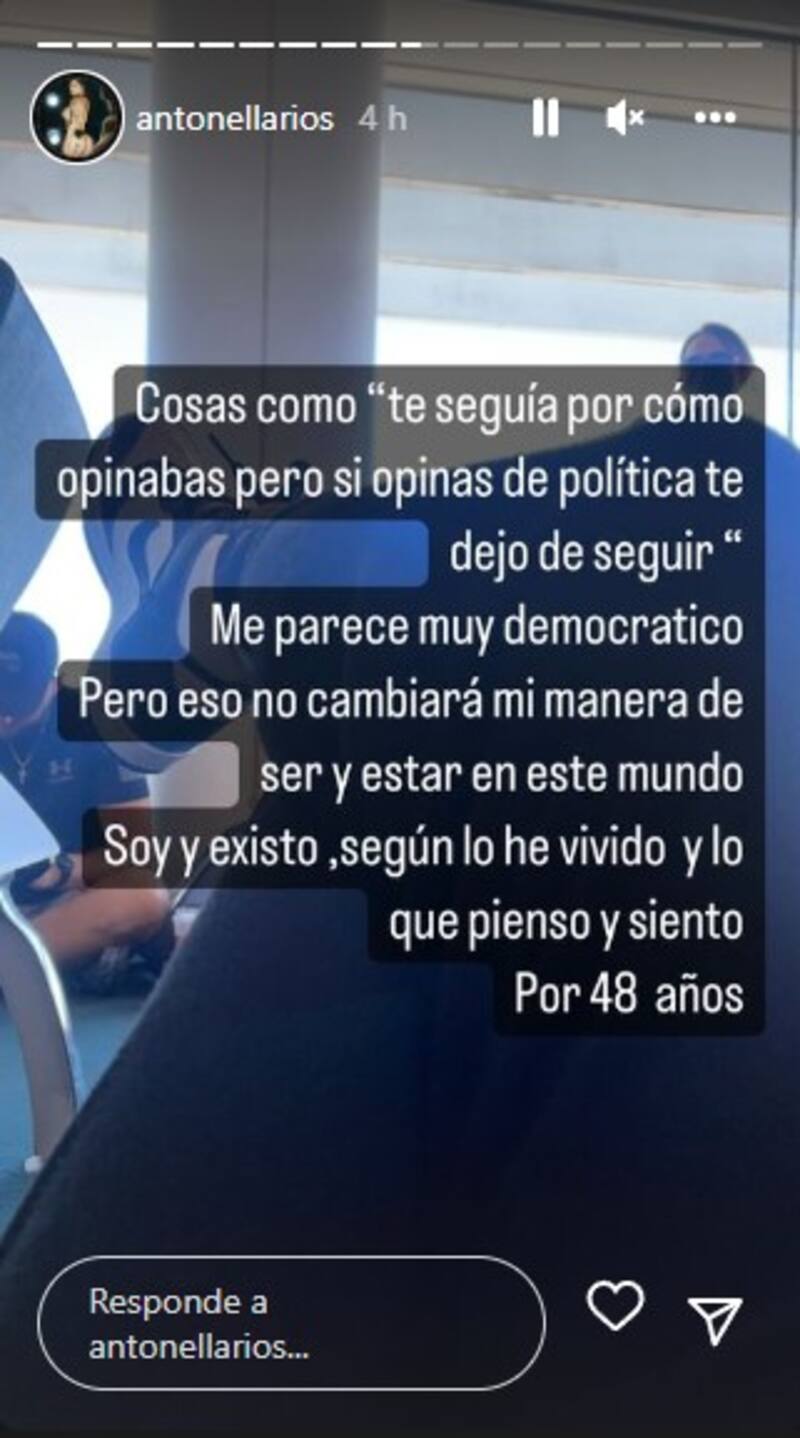 “Cosas como ‘te seguía por como opinabas pero si opinas de política te dejo de seguir’. Me parece muy democrático. Pero eso no cambiará mi manera de ser y estar en este mundo. Soy y existo, según lo he vivido y lo que pienso y siento por 48 años”, agregó la actriz sorprendiendo con sus dichos.