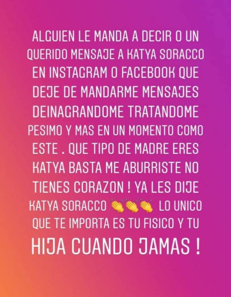 A través de sus historias de Instagram, la bailarina se fue con todo en contra de la mujer, a quien acusó de algunos malos tratos. "Alguien le manda a decir o un querido mensaje a Katya Soracco en Instagram o Facebook que deje de mandarme mensajes denigrándome, tratándome pésimo y más en un momento como este", comentó de entrada.