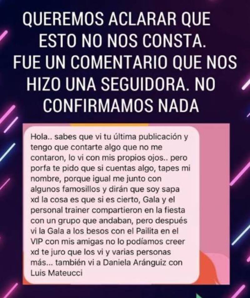 Y sobre la misma, agregaron: “la cosa es que sí es cierto, Gala y el personal trainer compartieron en la fiesta con un grupo que andaban, pero después vi a Gala a los besos con el Pailita en el VIP. Con mis amigas no lo podíamos creer. Te juro que los vi y varias personas más. También vi a Daniela Aránguiz con Luis Mateucci”.