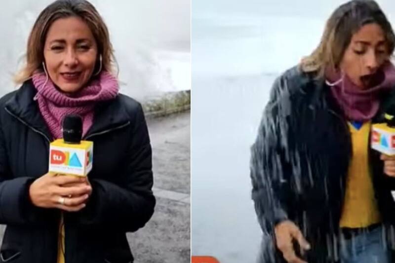 De hecho, fue precisamente en ese momento cuando la reportara sufrió un inesperado impasse tras ser mojada por una ola en vivo y en directo.