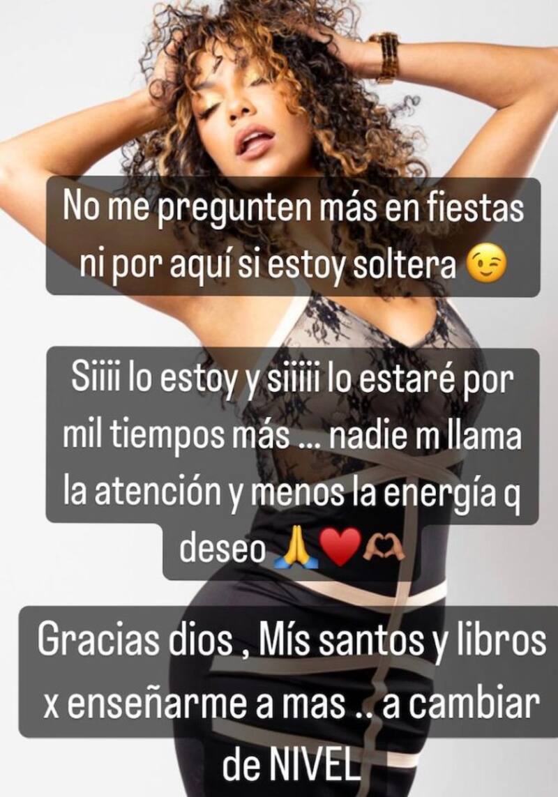 “No me pregunten más en fiestas ni por aquí si estoy soltera”, escribió en el formato de historias de la plataforma virtual, donde también agregó una coqueta postal.