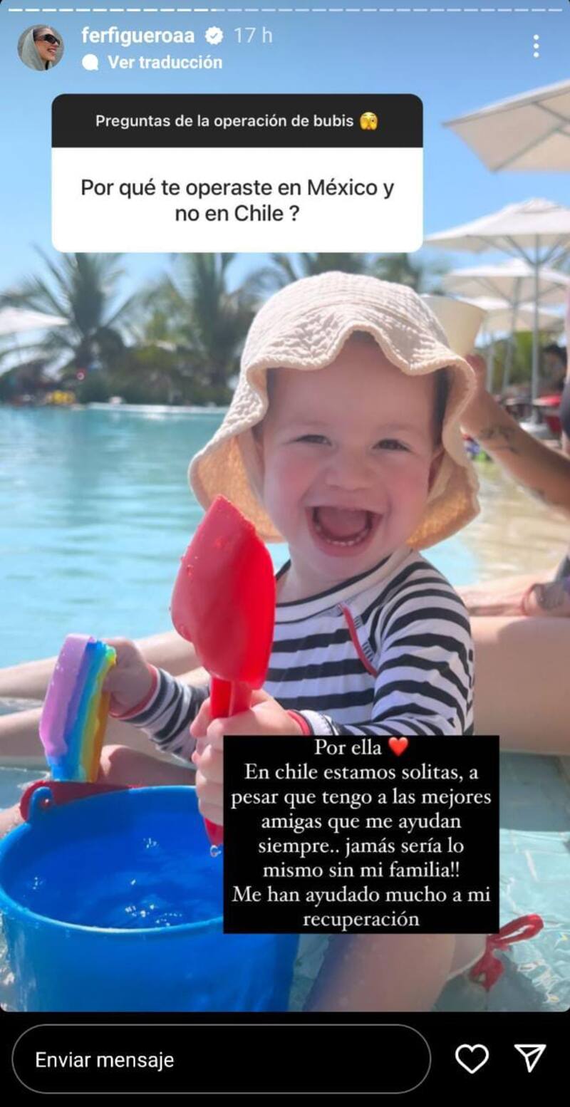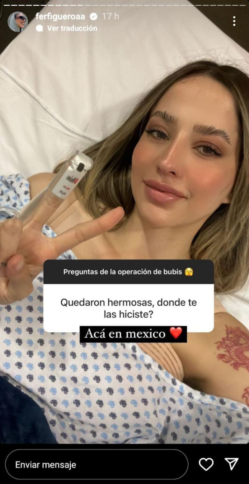 “Me puse 375cc”, detalló Fer Figueroa al hablar de las razones que la llevaron a ingresar al quirófano en México. “¿Por qué te operaste en México y no en Chile?”, le consultó un seguidor a lo que la influencer respondió que era por su hija.