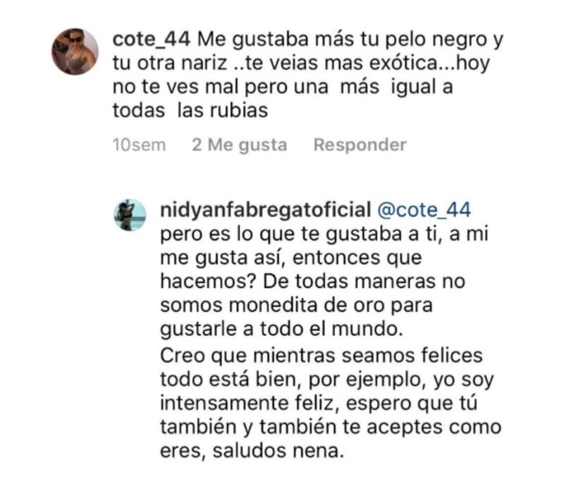 "Me gustaba más tu pelo negro y tu otra nariz, te veías más exótica", le comentó en una de sus fotos. "Hoy no te ves mal, pero una más igual a todas las rubias".