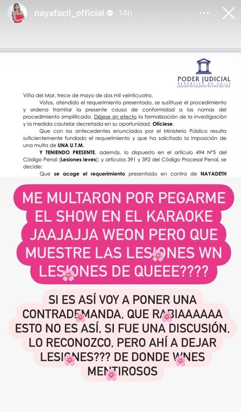 A través de su cuenta de Instagram, la influencer contó que fue multada por un conflicto que protagonizó antes de su viaje en un reconocido bar de Viña del Mar.