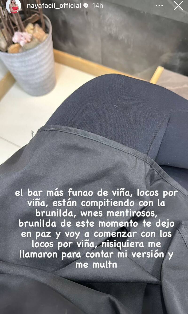“El bar más funao de Viña, ‘Locos por Viña’. Están compitiendo con la Brunilda, hue… mentirosos. Brunilda de este momento te dejo en paz y voy a comenzar con los ‘Locos por Viña’, ni siquiera me llamaron para contar mi versión y me multan”, complementó Naya.