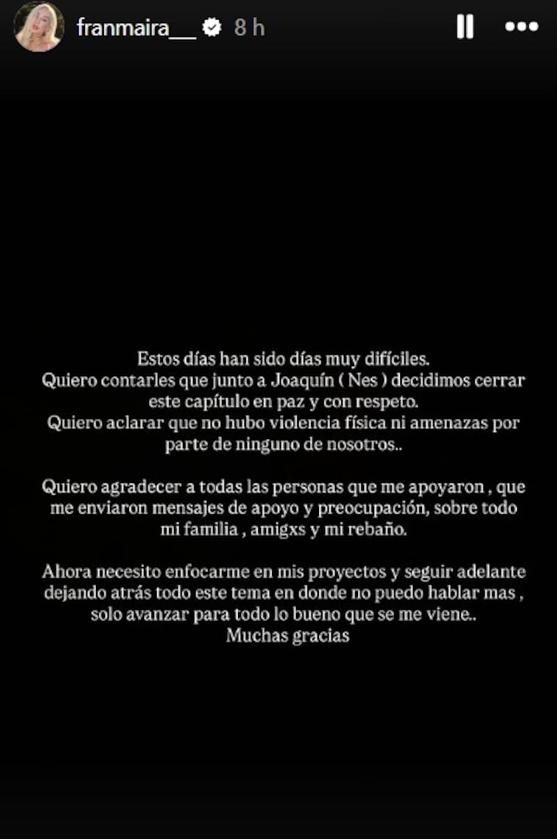 Tras varios días de silencio, Maira rompió el silencio a través de sus redes sociales. “Quiero contarles que junto a Joaquín (Nes) decidimos cerrar este capítulo en paz y con respeto”, expresó.