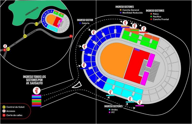 Entre los elementos prohibidos están los alimentos y bebestibles (se venderán adentro), cámaras con lentes intercambiables, punteros laser, botellas de plástico, vidrio o metal; aerosoles, sillas pisos o elementos contundentes y selfie sticks.