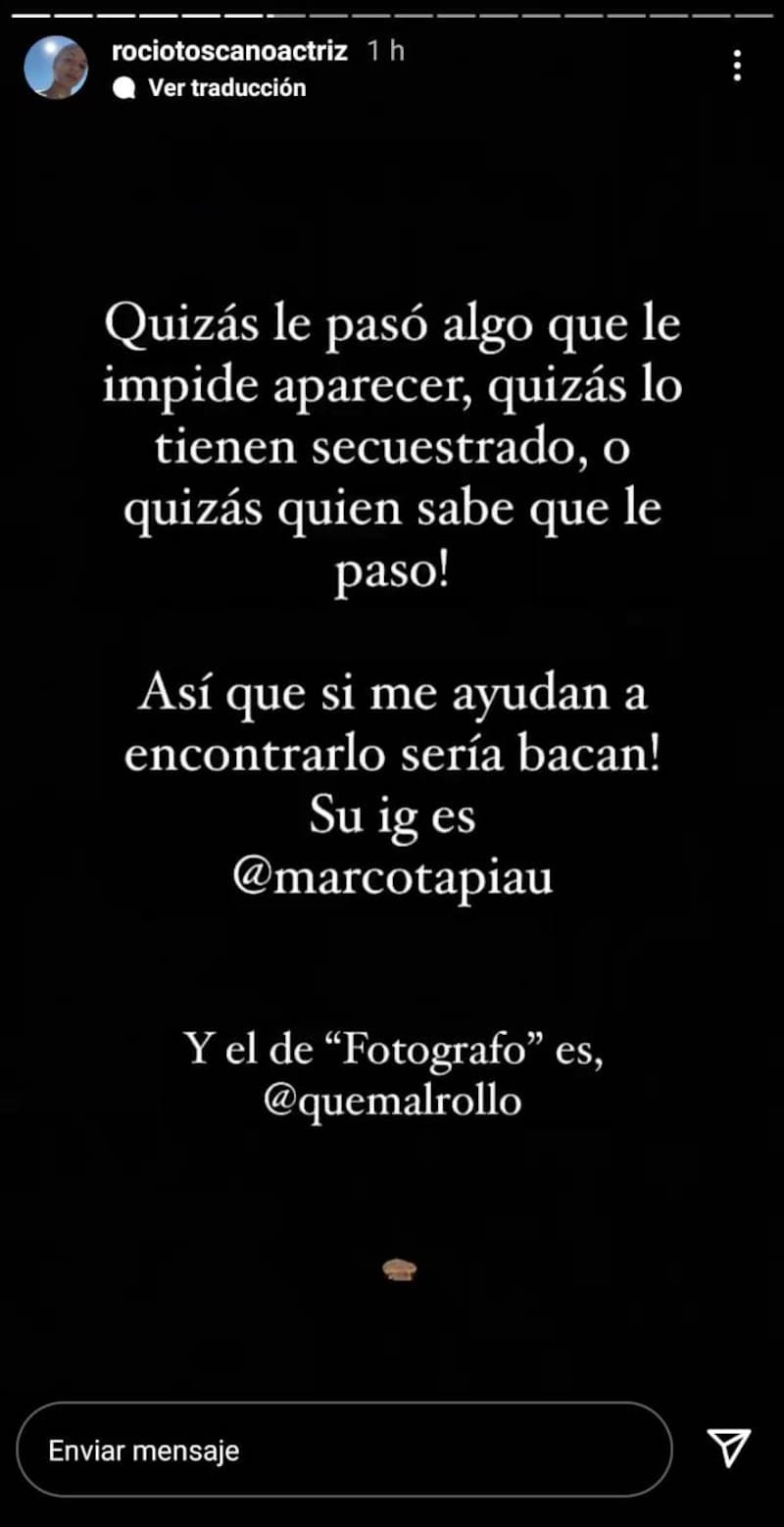 “Quizás le pasó algo que le impide aparecer, quizás lo tienen secuestrado, o quizás quien sabe que le pasó! Así que si me ayudan a encontrarlo sería bacán! Su ig es @marcotapiau y el de ‘fotógrafo’ es @quemalrollo”, agregó, recibiendo mensajes de apoyo.