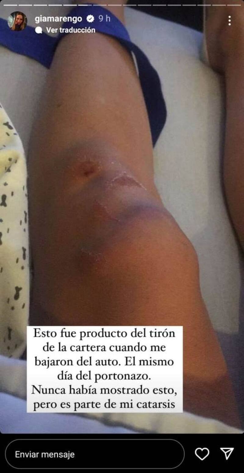“Esto fue producto del tirón de la cartera cuando me bajaron del auto. El mismo día del portonazo. Nunca había mostrado esto, pero es parte de mi catarsis”, detalló mostrando una herida que sufrió en la pierna en esa ocasión.